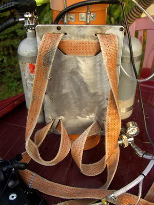 Die "bleiintegrierte" Rückenplatte, bestehend aus einem Alu-Deckel der ca. 4 mm dick mit Blei ausgegossen wurde. Trägt sich sehr angenehm. Bebänderung mit einem durchgehendem Kran- Ansschlaggurt(hält sicher einige Tonnen).
