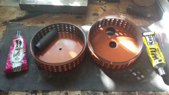 Feine Gage vor die Bohrungen eingeklebt. Dafür habe ich die Bespannung alter Campingstühle verwendet"