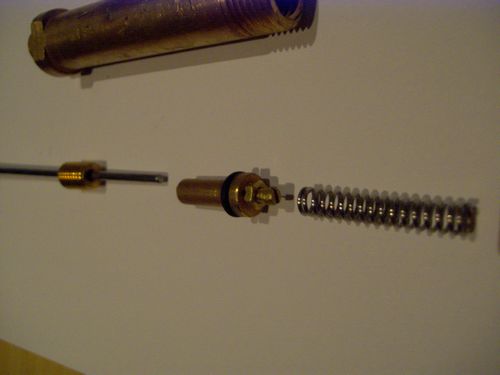 Einstellbare Drossel :-) , bestehend aus M3 Schraube die in ein nicht durchgeschnittenes Gewinde geschraubt wird. Dadurch wird es hinten enger und ein Fluß von z.B. 0,9 l/min läßt sich gut einstellen.