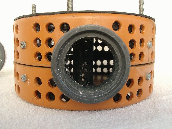 Der Atemkalk-Behälter in der Innenansicht. Er besteht aus zwei KG 150 PVC-Kanalrohr-Endkappen, die so gekürzt sind, daß ca. 1,25 kg Atemkalk hineinpassen.