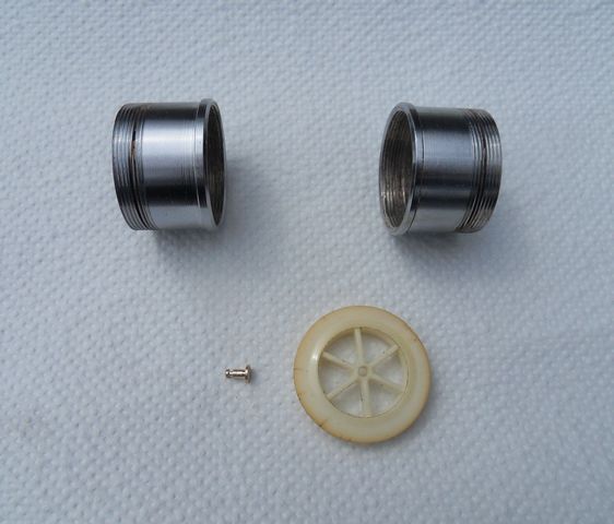 Die Wagenräder der Rückschlagventile sind im Vollgummimundstück in Messinghülsen eingeschraubt. Links neben dem Wagenrad liegt ein kleiner neu angefertigter Messingstift der die neuen Silikonscheiben tragen soll. Originale Flatterventile standen nicht zur Verfügung.