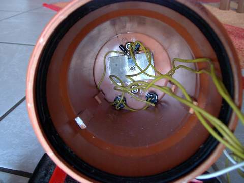 Da mein Akku 18V hat, dient ein Festspannugsregler zur Erzeugung der 12V für die Tauchlampen. Kühlung über durchgehende Schraube zum Griff.