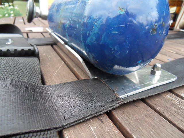 Als Traggestell der 0,8 Liter O2 Flasche habe ich ein trapezförmig gebogenes Alublech mit den Gurten verschraubt.