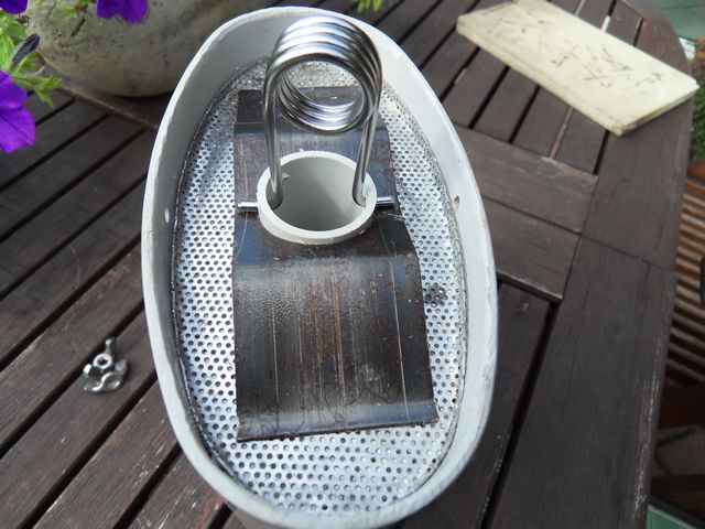 In den Behälter passen fast genau 1000g Kalk. Die Plastiksiebe wurden durch Edelstahlsiebe ersetzt und mittels Edelstahlfeder (Schaschlikspieß) verschlossen.