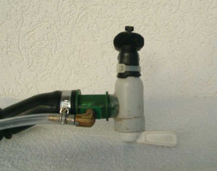 Das verschließbare Mundstück besteht aus einem Regenfaß-Ablaufventil. Seitlich ist die O2-Injektionsstelle zu sehen. Damit kann man gut das gesamte Totvolumen spülen!