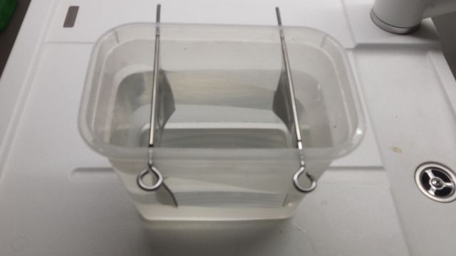 Das Nickelblech in das Essigwasser eingehängt, mit V2A Schaschlikstäben