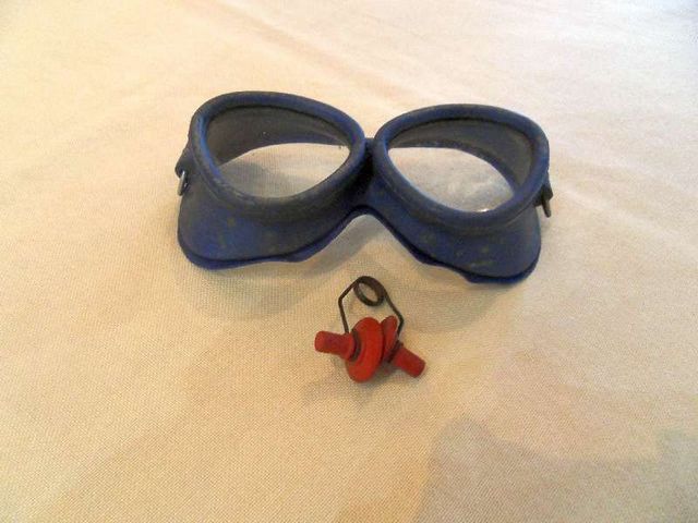 Das ist eine Original Medi Zweiglasbrille, gesehen im Sporttauchermuseum Berlin.