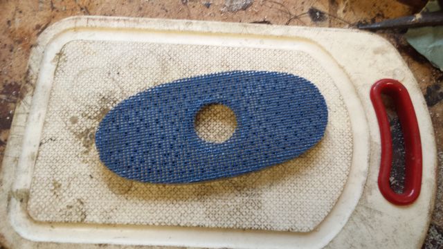 Damit der Kalk nicht durchrieseln kann wird ein feines Gewebe auf den Boden aufgeklebt. Tipp: Die Bespannung alter Campingstühle entfernen und aufheben. Das Gewebe ist sehr stabil und eignet sich hervorragend. Es ist aus außen aus PVC, innen glasfaserverstärkt und lässt sich gut kleben.