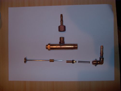 Das Ventil aus Schrott-Messing. Die Anschlüsse sind weich eingelötet. Der Betätigungsknopf hebt gesamten Drossel-Einsatz an und läßt dadurch O2 vobei.