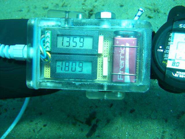 Test Unterwasser, mit nur einem Sauerstoffsensor - oben. Unten wird wegen des offenem Einganges Mist angezeigt.