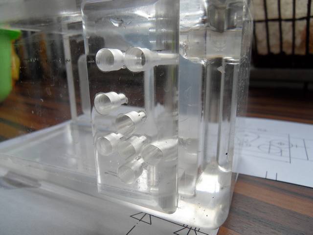 Das fertig geklebte Gehäuse erhält an den Durchführungen stufenförmige Bohrungen. Dazu wird der Bohrer leicht stumpf geschliffen und mit reichlich Kühlwasser vorsichtig gebohrt. An Reststücken vorher Probebohrungen machen um die nötigen Toleranzen zu bestimmen.