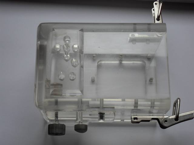Die Rückseite mit den Durchführungsbohrungen für alle Bedienelemente. Alle Kanten außen wurden erst rund gefeilt, dann mit feinem Wasserschlaifpapier beschliffen und zum Schluß mit Edelstahlpolitur (für Küchenherde) poliert - ein glasklares Ergebnis.