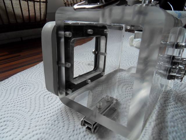 Blick von innen auf die Frontscheibe. Die Gewindebohrungen werden alle mit Acrylfix vergossen und so abgedichtet.