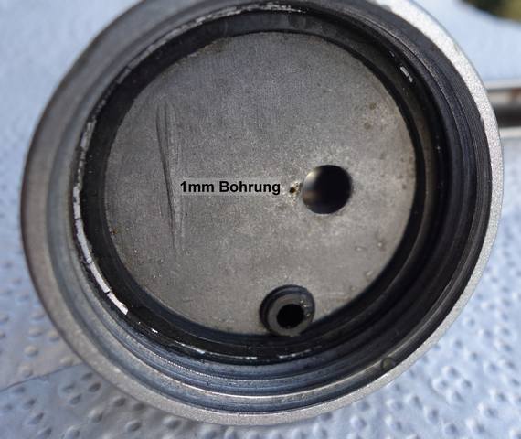 Ideal ist die Fettpresse nicht. Es gibt kein richtiges Einlassventil, es öffnet sich einfach eine Bohrung zum Wasserraum. Hier kann sich der O-Ring einklemmen. Um das etwas zu umgehen hab ich etwas tiefer eine 1mm Entlastungsbohrung angebracht. So kann sich der O-Ring erstmal ohne großen Gegendruck einfädeln.