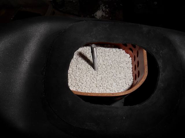 Hier mit abgenommenen Verschlußdeckel und mit Kalk befüllt. Das Verschließen erfolgt durch Auflegen einer gefederten Lochplatte die mit dem Verschlußdeckel angepresst wird.