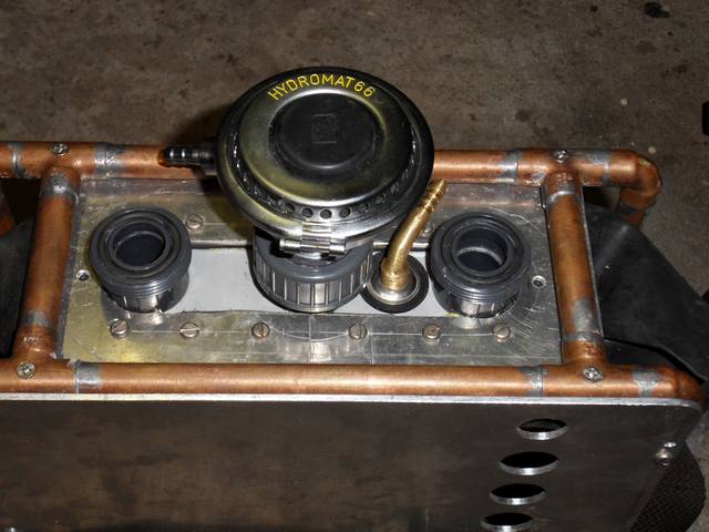 Das ADV kann damit mittig auf den Kalkbehälter angeschraubt werden. Die Einspeisung erfolgt in den oberen Bereich der Gegenlunge. Rechts daneben die O2 Konstantflusseinspeisung.