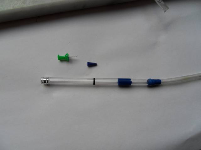 Der "Eichstrich" zeigt 0.8 Liter/min an, oben nochmal der Schwebekörper. Das Ganze wird jetzt senkrecht aufgehängt, die Gasquelle angeschlossen und los gehts. Ein Live-Video gibt es hier:Flowmeter