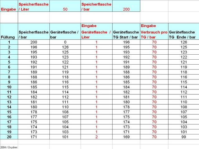 technischem Sauerstoff, den ich privat ausschließlich verwende. Die Formel ist ja bekannt: Luftmenge Flasche1 + Luftmenge Flasche 2 / Volumen Flasche 1 + Volumen Flasche 2.