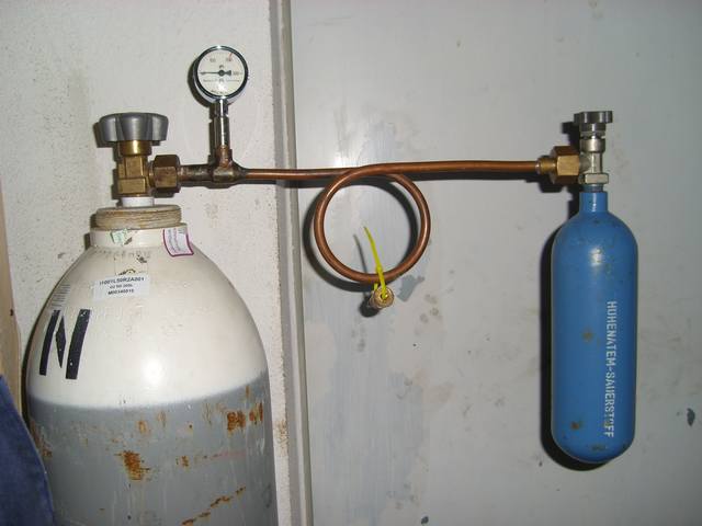 Übergeströmt wird durch l a a a n g s a m e s Öffnen der Faschenventile. Wobei ich die Strömung mit dem Speicherflaschenventil so einstelle, das so gut wie keine Erwärmung der Zielflasche auftritt. Danach noch mal abkühlen lassen und etwas nachfüllen.