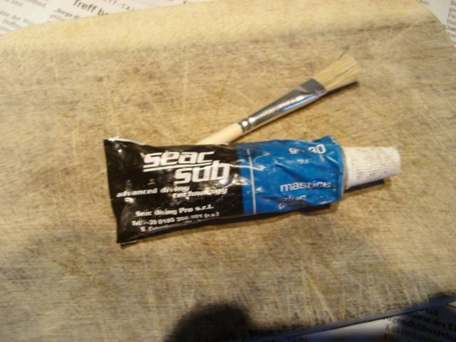 Als Klebstoff verwende ich diesmal den hier. Gleich gute Ergebnisse hatte ich aber auch mit Paxxxx hochwärmefest, man sieht nur die Klebstoffreste deutlicher. Ein kleiner Pinsel leistet gute Dienste beim einstreichen.