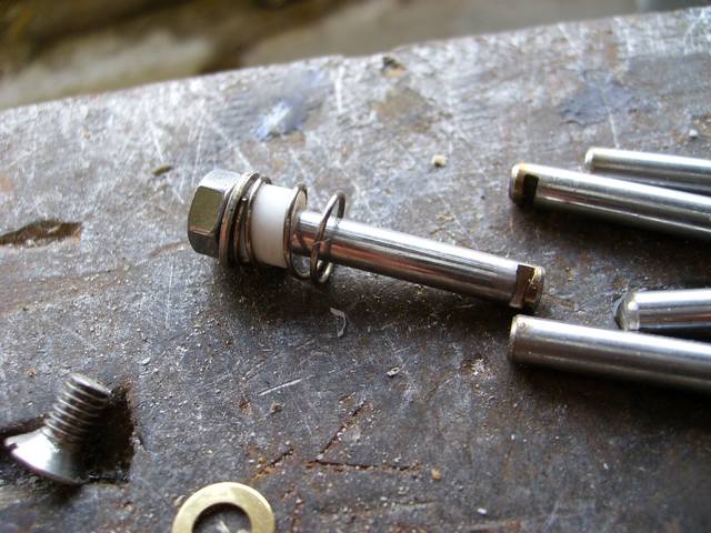 Die 4mm VA-Stifte. Reihenfolge: M4 Mutter-Führungshülse-Feder.