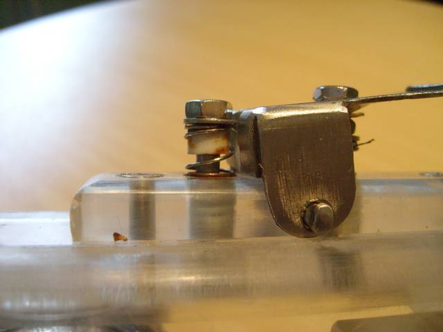 Detail vom Auslöser und Einschaltknopf. Man sieht den Rostansatz der Federn nach der Saison 2007 auch Salzwasser im Mittelmeer und Ostsee.