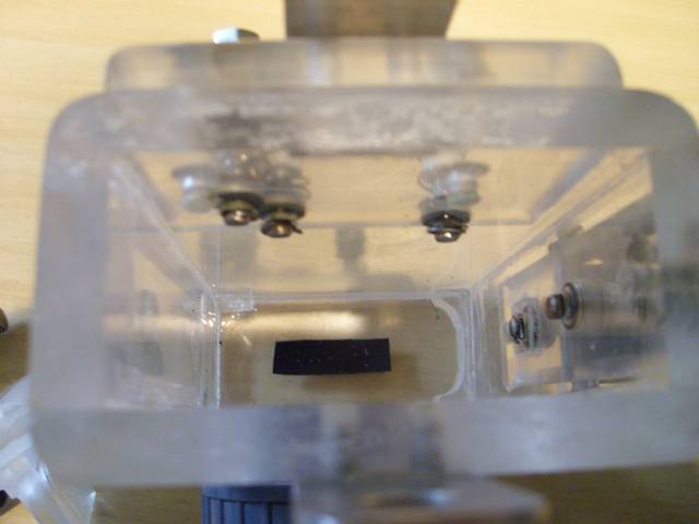 Das Gehäuse von innen. Damit die Stifte nicht rausrutschen sind Nuten eingesägt die mit VA-Draht-Krampen gesichert sind.