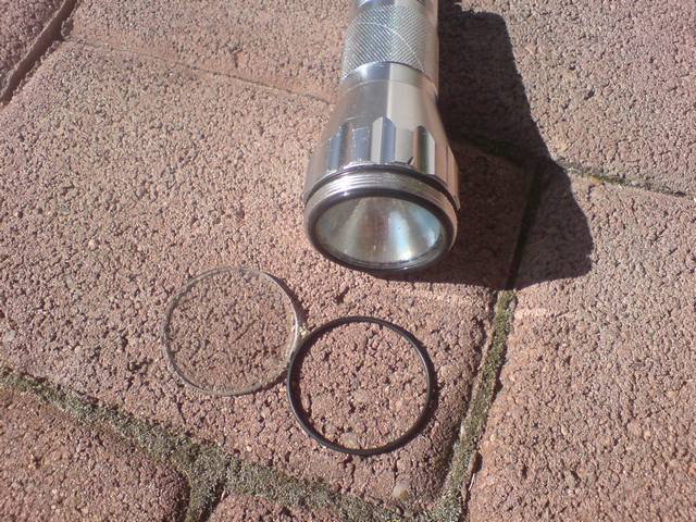 Das originale Lampenglas wird durch eine Zweischeibenkonstruktion ersetzt. Einmal 44 mm Drm. und einmal 51 mm Drm. ca je 3 mm dick. Die Dichtung übernimmt ein 3mm O-Ring der um die kleinere Scheibe gelegt wird.