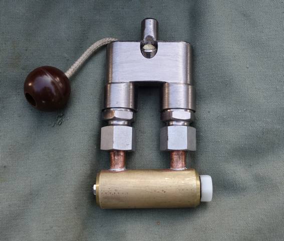 Das Konstantflowventil ist Eigenbau. rechts kann man das Flowmeter anschließen links das Nadelventil, bestehend aus einer schlank konisch gedrehten M3 Schraube welche in eine 1mm Bohrung stößt. Die Einstellung ist sehr feinfühlig möglich.