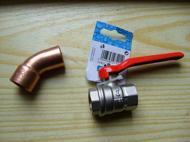 Die Baumarkt Einzelteile, ein 1/2" Heizungs-Kugelhahn mit Durchlass ca. 16mm und ein 45 Grad Kupfer Lötfitting.
