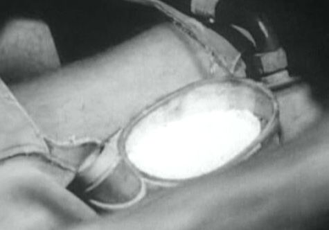 Kreislaufgerät Typ 2 Hier sichtbar der eingerüttelte Kalk. Der dchlauch für die O2 Zufuhr mündet direkt in den Atembeutel.